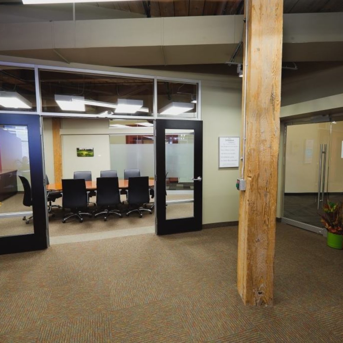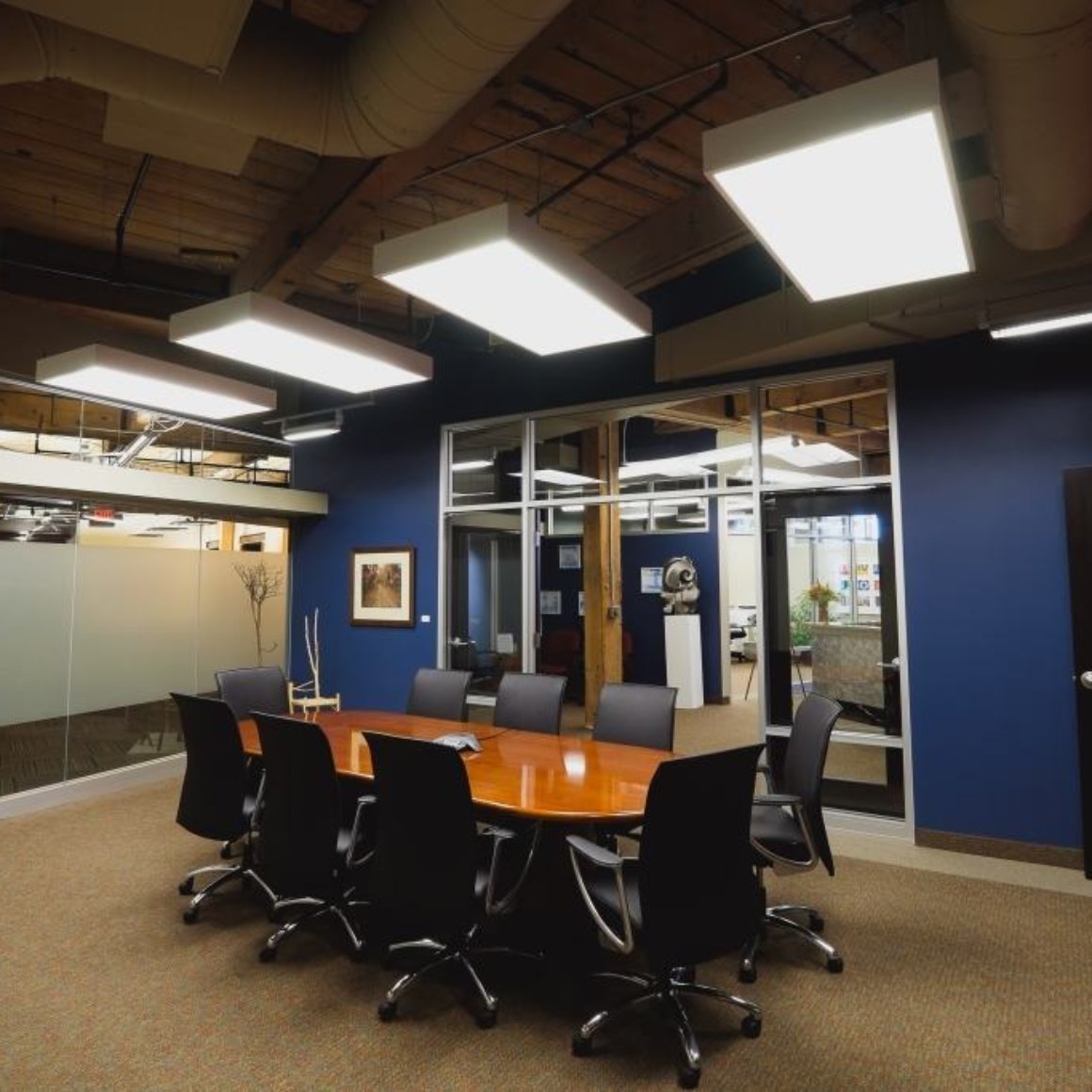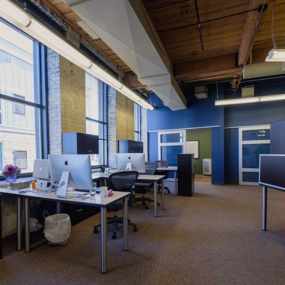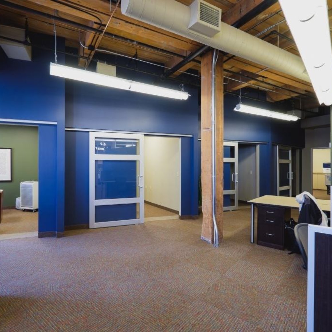 When it came to designing the space, the goal was to marry the progressive elements of the building with the more traditionally corporate culture of the company. The colors, floor covering and paint are identical to those used in the Northfield office but applied uniquely to accentuate the existing brick and wood elements. All new lighting was installed and a leased artwork program utilizing the work of local artists brings fresh painting and sculpture to the space every six months. A new entrance was created recouping formerly underutilized common area square footage into the space. The angled full glass wall creates a unique, eye-catching entrance that naturally draws people in.